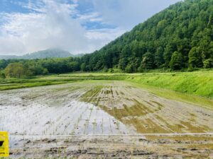 田植え後の畦にはキツネ、アライグマ出現中。。