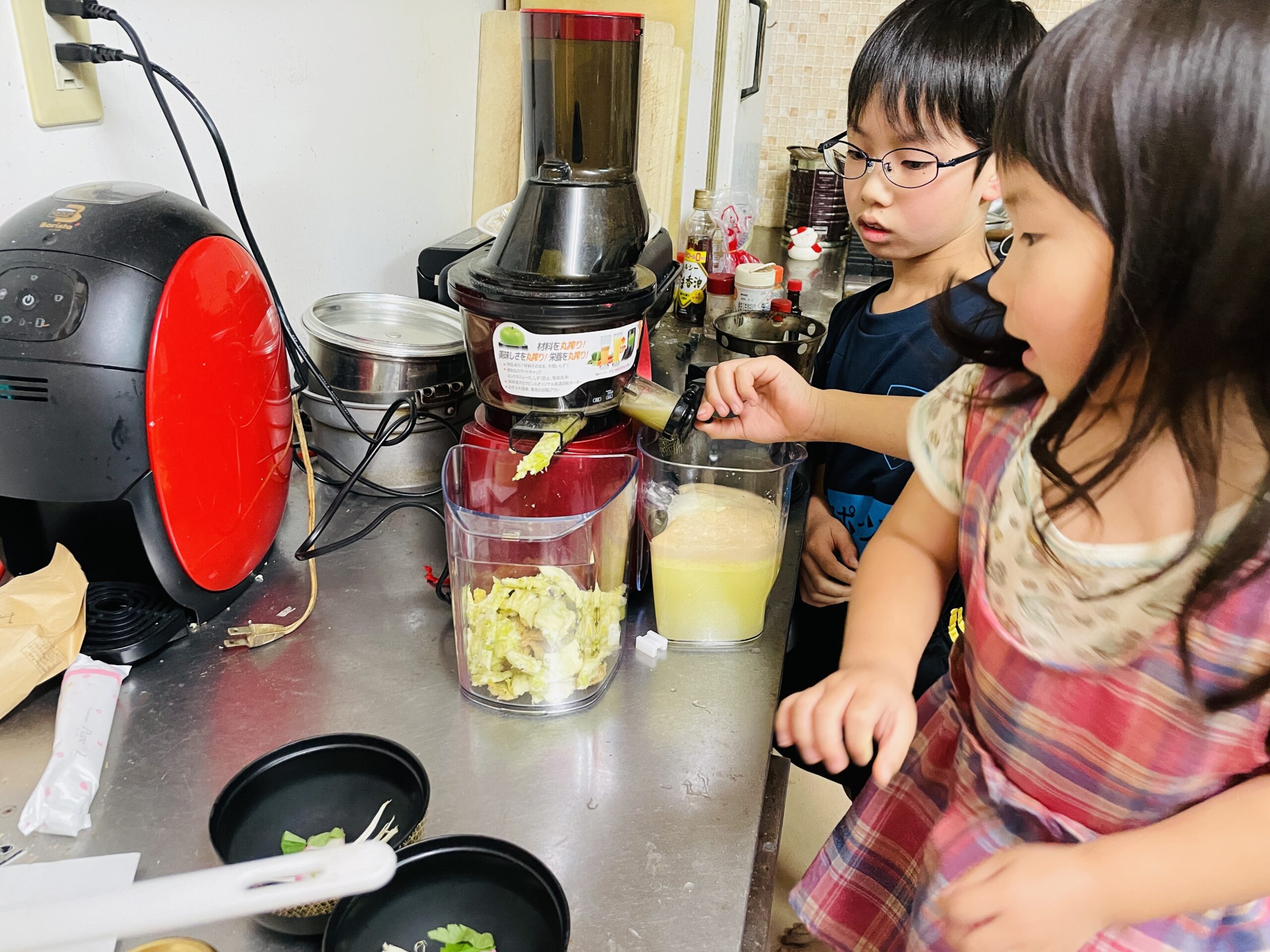 収穫後に息子の念願であったリンゴをジューサーにかけてリンゴジュースを作りました。