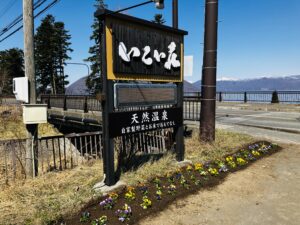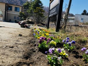 旅館駐車場の花壇と看板にも植えました。